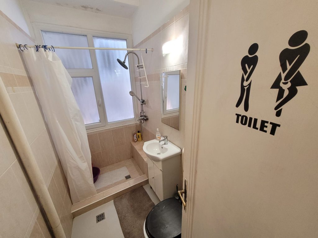 The common areas: A kitchen adjacent to a sitting area with a dining table and a shared bathroom.