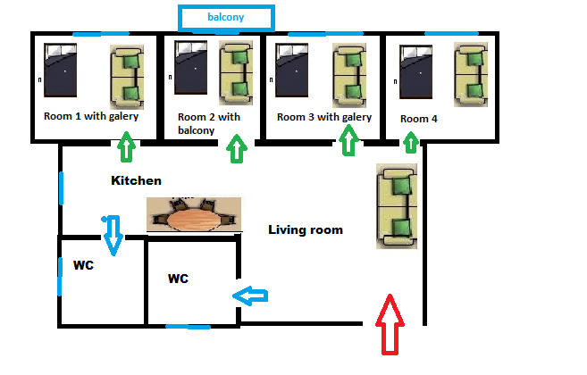 The rooms: 4 separated bedrooms, each one has a double bed, a sofa bed, a closet, and a study desk. Room number 2 has a private balcony looking into the main boulevard.
