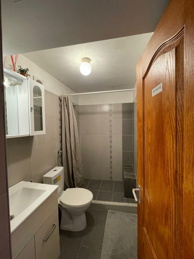 The common areas: The apartment has 2 complete bathrooms in total. A kitchen, a living room with a dining table area.